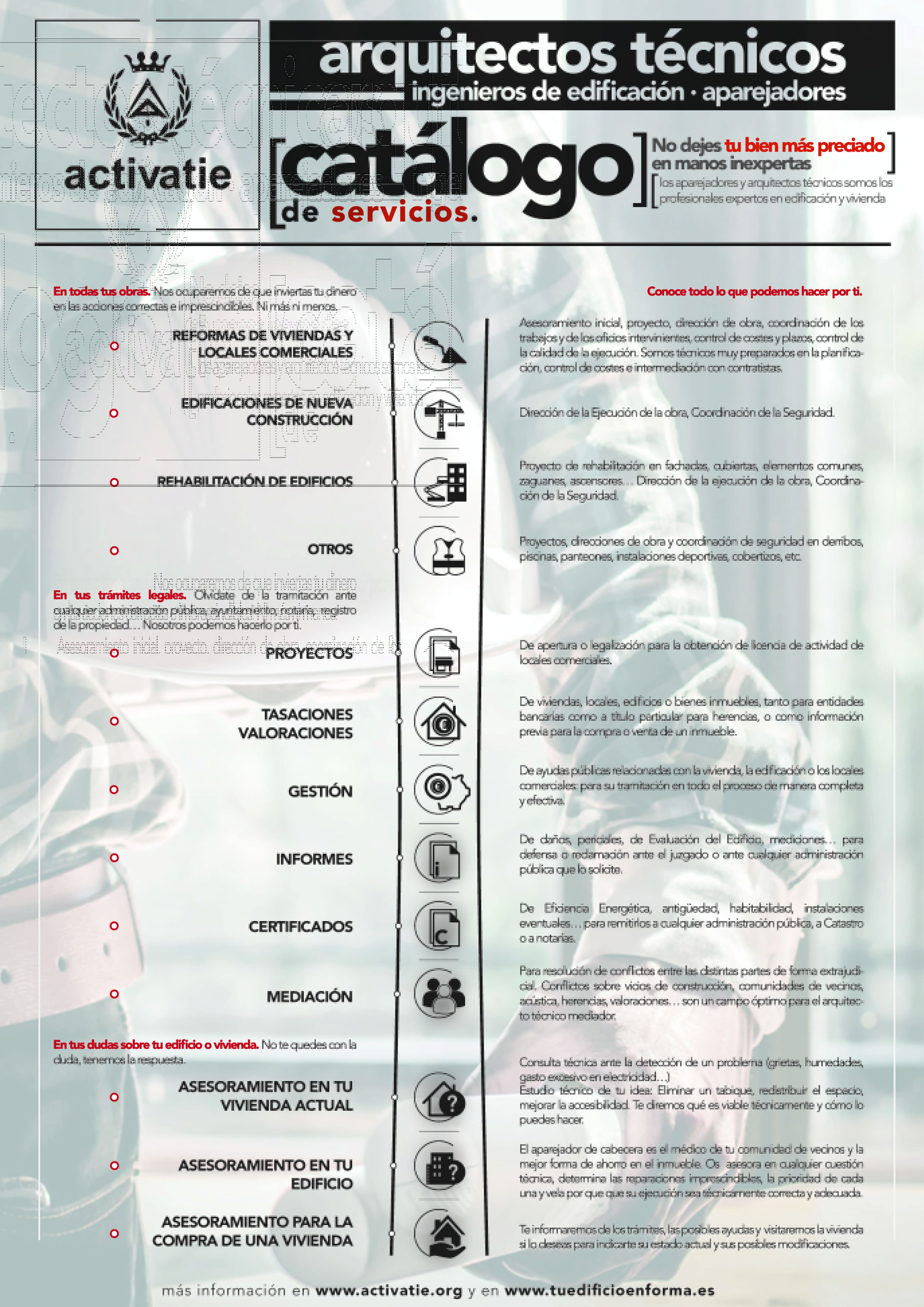 Activatie crea un catálogo de servicios de la Arquitectura Técnica, como elemento de marketing que pone a disposición de colegios y colegiados para difundirlo en redes sociales, o para utilizarlo en presentaciones o en correos electrónicos, y así, dar a conocer a nuestros contactos todos los servicios que como profesionales de la edificación se pueden ofrecer.