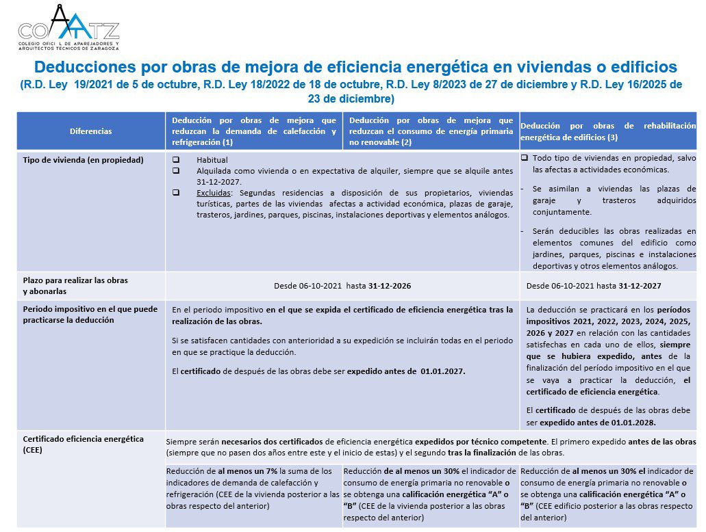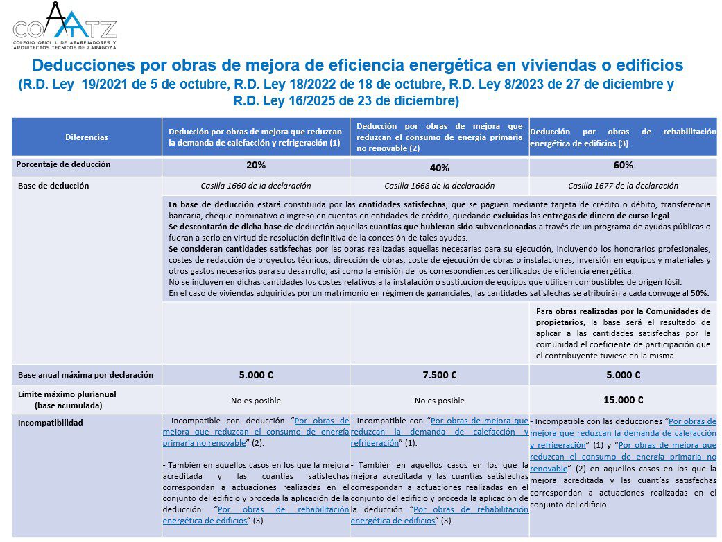 Adjuntamos cuadro informativo de las deducciones por obras de mejora de eficiencia energética en viviendas o edificios que incluyen las actualizaciones publicadas hasta la fecha.